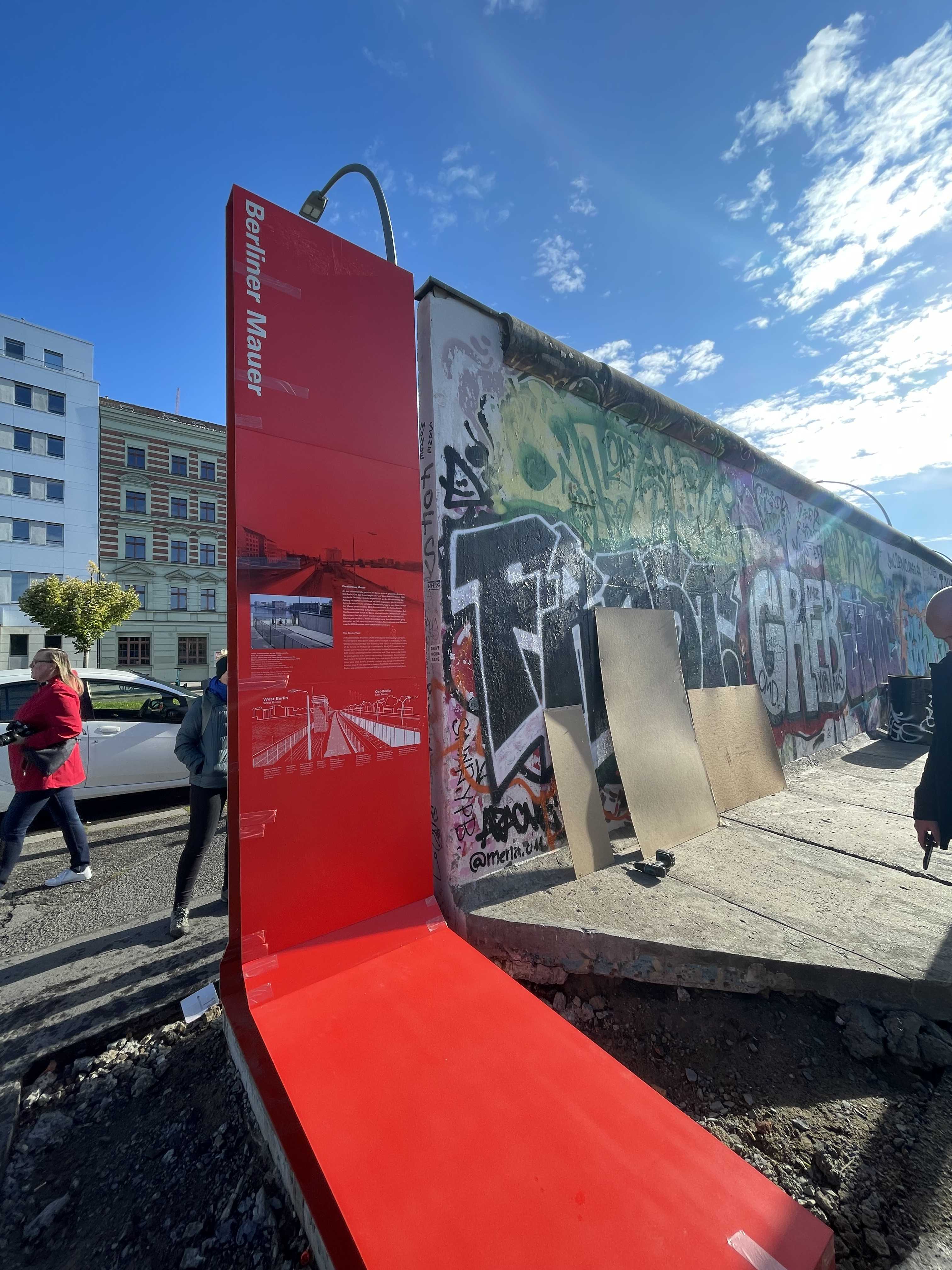 Die Stiftung Berliner Mauer erarbeitet zudem eine neue Open-Air-Ausstellung für die East Side Gallery vor, die im November 2022 fertiggestellt wird. Erste Teile, darunter drei sogenannte „Mauerwinkel“ stehen bereits. Sie geben grundlegende Informationen zum Ort. Ergänzt werden sie ab November von 15 Quaderstelen, die vertiefende historische Informationen geben.
