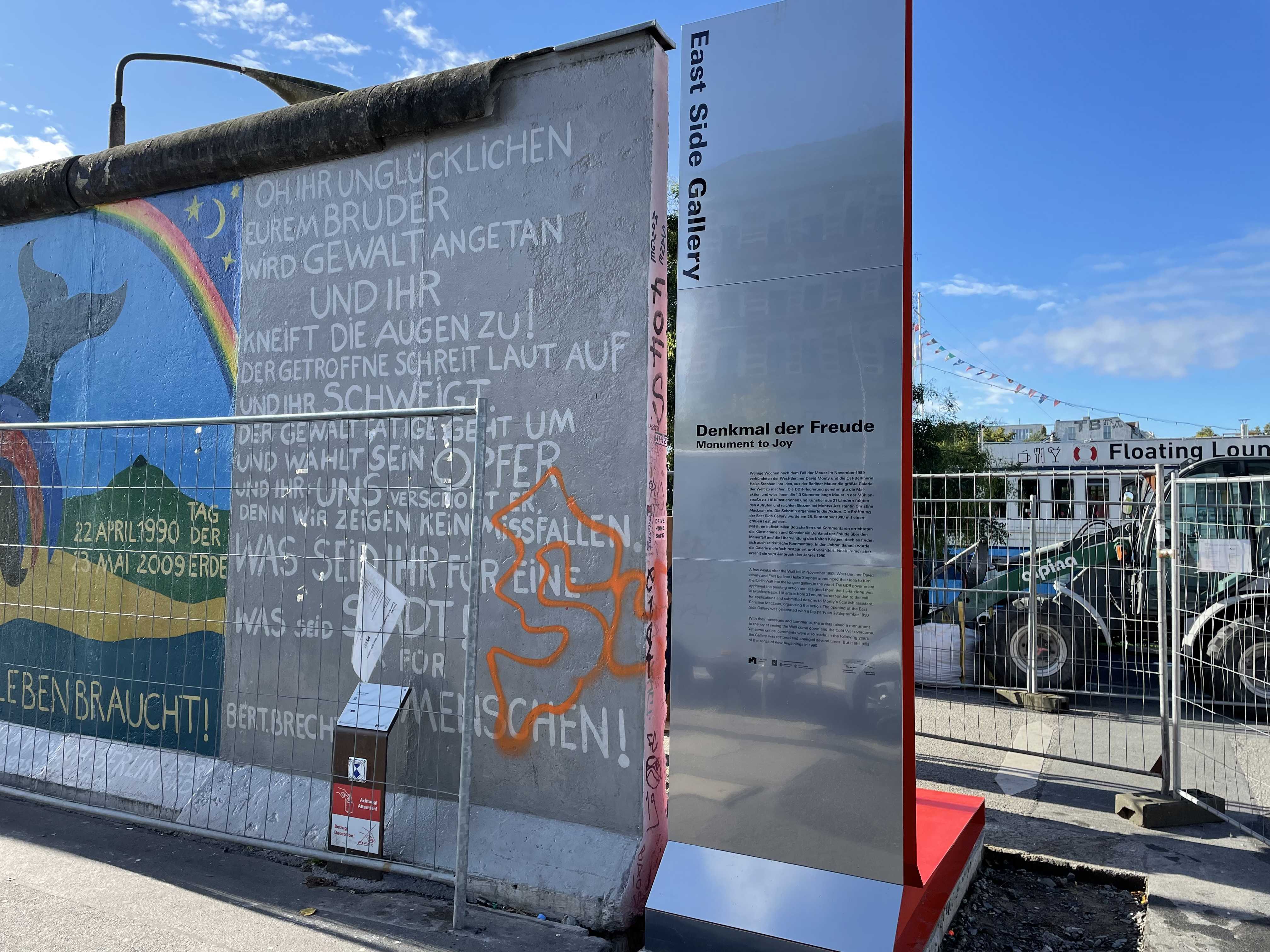 Mit den bereits vor Ort aufgestellten drei „Mauerwinkeln“ und der Fertigstellung von 15 weiteren Quaderstelen der neuen Open-Air-Ausstellung im November, erhalten Besucherinnen und Besucher erstmals vertiefende historische Informationen zu den Kunstwerken, zu den Künstlerinnen und Künstlern von 1990 und zur Geschichte des einmaligen Erinnerungsortes.